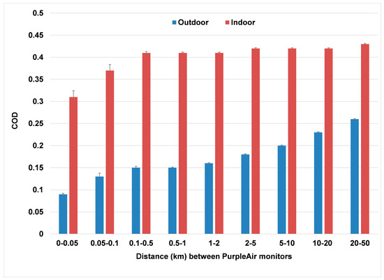 There was excellent agreement (to within 2%) between regulatory and PurpleAir monitor estimates of PM2.5 for distances of 0–0.5 km. This result confirms the most recent calibration factor of 3.4 for both PMS 1003 and PMS 5003 sensors using the ALT-CF3 algorithm [27]. The PurpleAir mean PM2.5 decreases somewhat with increasing distance from the regulatory sites, reaching about 13% lower than the regulatory monitors. This is expected since most residences are located away from the center city and other areas with expected higher emissions (e.g., busy roadways). The higher incomes associated with homeowners using PurpleAir monitors would also allow living in areas with better environmental surroundings [15]. However, the increasing difference between regulatory and PurpleAir measurements with distance directly affects COD values, even though we believe both measurements are correct. The COD values may be misleadingly high if the monitors of one type are located in areas that have different concentrations than those with monitors of the second type.