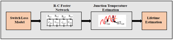 Block i estimates Nf based on the junction temperature, which is estimated using a switch loss model. The procedure is shown in Figure 3. This block’s three main components are the switch loss model, R-C Foster-network-based junction temperature estimation, and lifetime estimation. The switch loss causes are the mean junction temperature (TJ,m) and junction temperature variation (ΔTJ). Wire-bond lift-off and solder fatigue are the two dominant open-circuit failure mechanisms triggered by HF thermo-mechanical stress. A mismatched coefficient of thermal expansion (CTE) between different layers increases the severity of this stress [17,19]. These dominant mechanisms result in wire-bond cracks and solder degradation or eventual lift-off. In the following subsections, these three components are discussed.