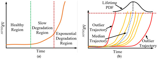 In this paper, a power-cycling ALT is used for mapping the RDS,ON trajectory. The ALT conditions and switch degradation mappings are provided in Section 7.2. The RDS,ON trajectories show that there are three distinct regions in the life of the cascode GaN-FET—(i) the healthy region, (ii) the slow degradation (SD) or constant degradation (CD) region, and (iii) the exponential degradation (ED) region. These tendencies in the RDS,ON trajectory are shown in Figure 5a. There are also RDS,ON trajectories that are outliers to the typical trajectories, as shown in Figure 5b. These outlier trajectories bias the mean RDS,ON trajectory. It is logical to model the degradation trajectory using the median RDS,ON trajectory, which is not significantly affected by outliers. This median trajectory is modeled as follows:
