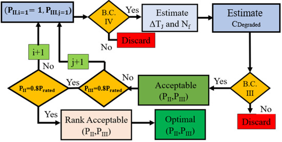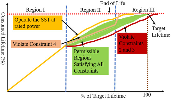 where C1, C2, and C3 are consumed life in regions I, II, and III, respectively. The derating algorithm is shown in Figure 6. As the switch will be more degraded in the exponential degradation (ED) region than in the slow degradation (SD) region, it is logical to impose higher derating in the ED region. Based on the constraints, the allowed operating conditions are shown in Figure 7. When the switch is healthy, the SST operates as rated. However, the SD and ED regions’ operating conditions are programmed based on constraints 1–4. If the SST operates at Pmin, it will have a maximum lifetime, but it will violate constraint 3. If the SST operates at Prated, J will be maximized, but the SST will fail before its target lifetime. Different combinations of operating conditions in these two regions lead to different lifetimes for the SST. To integrate these dynamic operating conditions, Equation (26) is used to estimate lifetime consumption under each condition. Eon and Eoff are integrated into the proposed controller as a look-up table to reduce the computational burden.
