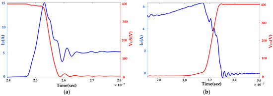 Commutation inductance due to the PCB layout plays a vital role in switching loss estimation. These inductances change with the PCB layout, which is application dependent. Thus, it is essential to conduct a DPT on the same PCB layout as the SST to address these inductances’ effect on switching loss. VDS and Id measurements require high-bandwidth probes. A differential voltage probe (TMDP0200) and coaxial shunt 0.1 Ω SSDN-10 current sensor are used for fast, high-precision measurements. VDS and Id are shown in Figure 10 during the turn-on and turn-off transitions. Turn-on and turn-off losses are estimated by calculating energy losses due to the crossover of VDS and Id. Moreover, these signals are properly aligned to improve the integrity of the testing.
