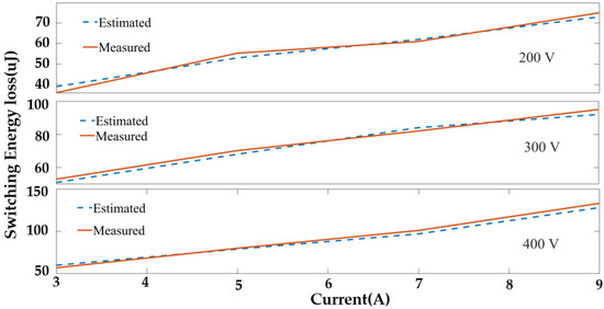 The rates of change in VDS and Id during turn-on and turn-off are estimated from the DPT test and the datasheet, along with ringing region parameters. These parameters are used in Equations (3)–(25) for switching loss estimation and are integrated into the controller. The estimated switching loss is compared with the measured loss from the DPT at different operating conditions to validate the proposed switching loss model, as shown in Figure 11. This behavioral switching-loss model closely follows the experimental switching loss tendency and has a 2.3% average mean squared error. The model is fast, parameter extraction is easy, and the model follows the experimental model’s loss tendency closely.