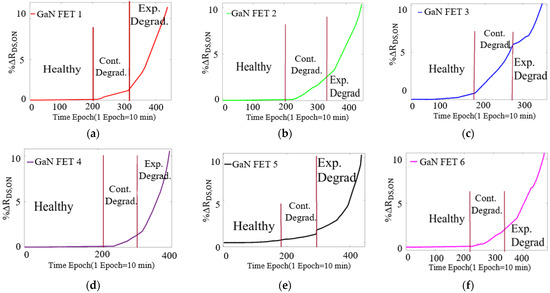 Actual trajectory of RDS,ON: (a) GaN-FET1, (b) GaN-FET2, (c) GaN-FET3, (d) GaN-FET4, (e) GaN-FET5, and (f) GaN-FET6.