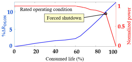 It was observed that, until 60% of the way through their life, the switches were in the healthy region. In this region, ΔRDS,ON is between 0% and 2%. From 60% to 80% of the switches’ lifetime, the switches were in the SD region, where ΔRDS,ON is between 2% and 7%. When ΔRDS,ON is greater than 7%, the switch is in the ED region. The statistically modeled median RDS,ON and the dynamically programmed estimated optimal operating trajectory are shown in Figure 14.