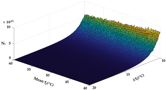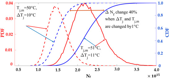 The derated operating condition reduces the junction temperature experienced by the switch. The lifetime profiles for different values of TJ,m and ΔTJ are shown in Figure 16. The PDFs and cumulative density functions (CDFs) of Nf at (ΔTJ = 10 °C, TJ,m = 50 °C) and (ΔTJ = 11 °C, TJ,m = 51 °C) are shown in Figure 17. When TJ,m and ΔTJ are reduced by 1 °C, the CDF becomes less steep. If the switch keeps operating in the rated condition, it will fail at 96% of the rated lifetime. The proposed derating condition considers switch degradation and achieves the rated lifetime, extending the switch’s life by 4%. This extended life is crucial for scheduling maintenance before the switch fails.