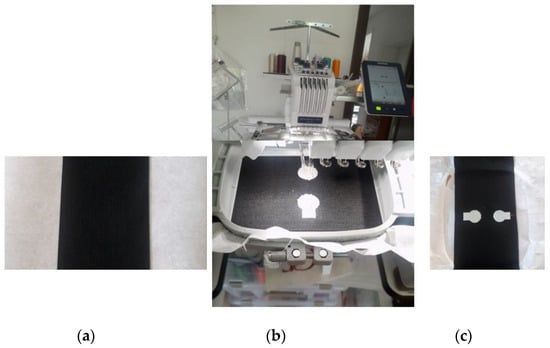 Experimental setup for Embroidery electrode fabrication: (a) Bandage attached on adhesive paper; (b) embroidering process; (c) embroidered electrode samples direct on bandage.
