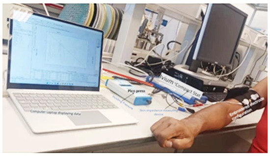 Ivium “CompactStat.h10800” connected with two embroidered electrodes on an elastic strap was used for impedance measurements, after wrapping it on the biceps muscle of the subject, see Figure 3. EMG signals were acquired using the BIOPAC Student Lab device (BIOPAC Systems, Inc., Goleta, CA, USA) with a three-electrode configuration. Data were visually inspected during acquisition and the digital signal processing, and feature extraction was performed using the MATLAB Simulink environment (MathWorks, Natick, MA, USA). Time domain features in the EMG signal such as the RMS, ARV, and SNR were determined as shown in Figure 4. The SNR (dB) for the effect of load, and pressure on embroidered EMG electrodes in comparison with gel electrodes. SNR (dB) was calculated using Equation (1).