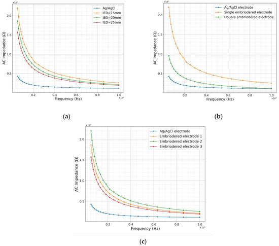 (a) Effect of inter-electrode distances (IED), (b) double layering, and (c) repetition with 3 similar samples (triplicates) on the impedance of the textile electrode in comparison with Ag/AgCl electrode measured on human biceps muscles.