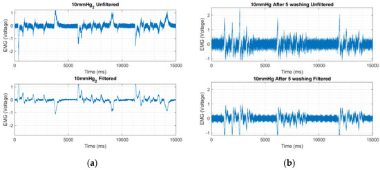 EMG signals recorded using hybrid thread-based embroidered electrodes: (a) before washing; and (b) after the fifth wash cycle out of the total six wash cycles.