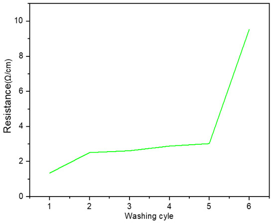 To investigate the wash stability and the embroidered electrodes’ resistivity performance, the embroidered electrodes were washed for up to twenty cycles in a domestic washing machine. As per the ISO norm, 105-C06-A1S, 2010 standards, the samples were washed with 4 g/L nonionic detergent and 1 g/L sodium carbonate at 40 °C for 30 min washing per cycle. In addition, the samples were dried with compressed air for 12 h at room temperature. To investigate the effects of washing on the electrical properties and wash stability performances of the embroidered electrode, the surface resistance of the washed electrodes was measured via the two-point probe method using a Falcondmm-10 multimeter across multiple participants as shown in Figure 6. Thereafter, the surface resistance increased almost four-fold. The mechanical action of the laundry affected the conductive truck of the samples and increased its electrical resistance.