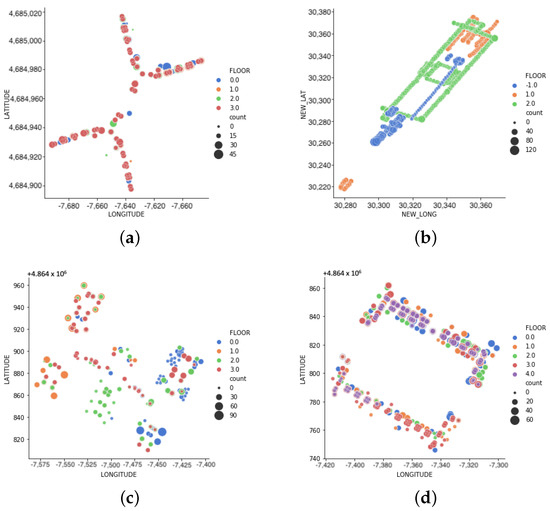 Base Datasets—Data Point Illustration. (a) UJI-Building0. (b) BC-Building. (c) UJI-Building1. (d) UJI-Building2.