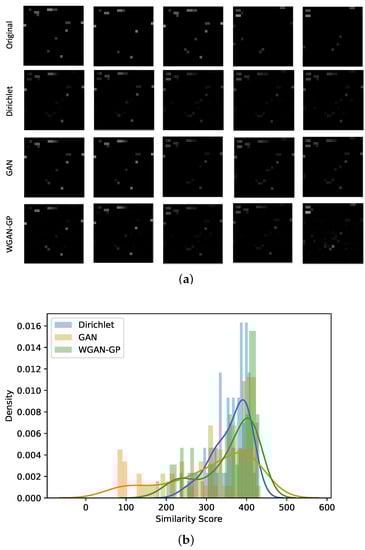 Figure 3a illustrates the variety of the received signal strength (RSS) at a particular location for each AP, where its RSSs are represented in each cells (ranging from black −110 and white 0). Among the nine data points, there are about five unique patterns representing the [−7637.2570, 4,864,949.8143] coordinate. This scenario explains the fingeprint being collected at different occasions at the same place. Hence, the objective of the data augmentation is to be able to replicate this variety of RSS with reduced manual data collection effort. Observing the data produced by Dirichlet, it was as if the five unique AP patterns were combined into one, where the augmented data embodies the interpolation of existing RSS values. Likewise, the data generated by GAN shows similarity to the data of Dirichlet with a few additional patterns. WGAN-GP is observed to produce most versatile behaviour, which almost showcases the unique patterns shown by the original. Moreover, it illustrates new variations with detected AP involved. According to the aforementioned objective, the data from WGAN-GP manage to produce the data as intended.