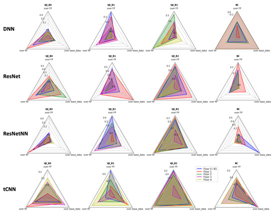 Another important evaluation parameter is “over base_data” where the focus is whether extendGAN+ data augmentation again increases in performance in comparison to the base dataset using the same localisation method. It is not surprising that not all three localisation methods improve at the same rate with the data augmentation. The performance varies depending on the samples and model architecture. The maximum improvement is 18.88% on average. Figure 5 depicts the corner examples of the data augmentation using extendGAN+. The proposed method yields significant improvement at UJI_B2F4 and BC_F-1 in contrast to UJI_B2F3 and BC_F2. UJI_B2F4 does not have the training data covering the test dataset that causes the localisation model to be less accurate with the limited data. BC_F-1 brings up a comparable example to the urban building complex, e.g., a shopping mall, where the center of the area is hollow. In this case, the RSS of APs from other floors are affecting the collected data of the target floor. It causes the prediction to be inaccurate. The data augmentation could add to the fingerprint cases to improve the accuracy.
