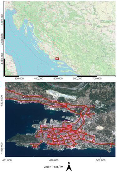 This study was conducted in the wide area of Split. It is the second largest city in Croatia, with 161,312 inhabitants [42]. Therefore, this study focused on the collection of specific road attributes in urban and suburban areas. The total length of roads and highways surveyed was 83.5 km. The study area is shown in Figure 1, with the observed roads marked.