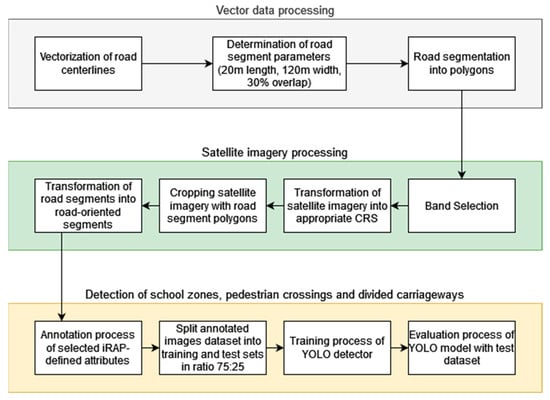 The study was divided into three phases. The first phase consisted of vector data processing, vectorization of road centerlines, and segmentation of observed roads with specific dimensions of road segments and percentage of overlap. The second phase included satellite image processing, band selection, cropping of the images with the boundaries of the road segments, and transformation of the cropped images to align the road centerline with the Y axis of the coordinate reference system (CRS), i.e., generating road-oriented images. Finally, the road segment images were used to detect school zones, physically divided roadways, and four types of pedestrian crossings. A complete overview of the workflow is shown in Figure 2.