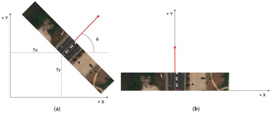 Transformation process of cropped road segments. Red arrow presents centerline of road, while Tx, Ty, and θ are transformation parameters; (a) translation by Tx and Ty distances and rotation for θ angle; (b) transformed road segment with centerline aligned with Y-axis (road-oriented).