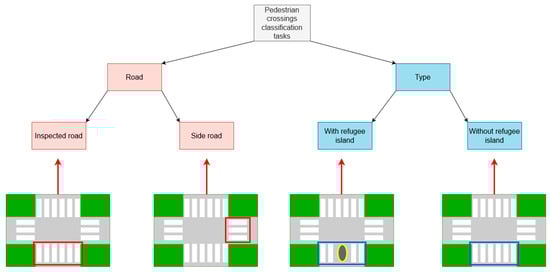 Diagram of pedestrian crossing classification tasks and classes annotated for this study with appropriate examples. Red arrow presents centerline of inspected road.