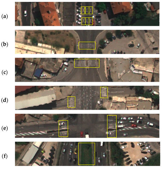 An annotation example of school zone road markings is shown in Figure 5a. By integrating two pedestrian crossing classification tasks, this paper ultimately focused on four classes of pedestrian crossings: pedestrian crossing on the inspected road (Figure 5b), pedestrian crossing on the inspected road with a refugee island (Figure 5c), pedestrian crossing on the side road (Figure 5d), and pedestrian crossing on the side road with a refugee island (Figure 5e).
