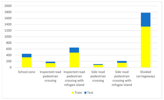 Distribution of annotated samples of school zones, divided carriageways, and pedestrian crossing classes. Number of training samples are shown in yellow, while test samples are shown in blue.