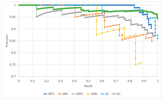 Precision–recall curve generated for each class with IoU and confidence thresholds at 0.5. It is visible that the object detector achieved a significantly lower precision–recall tradeoff for SRRI and IRRI classes.