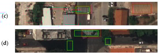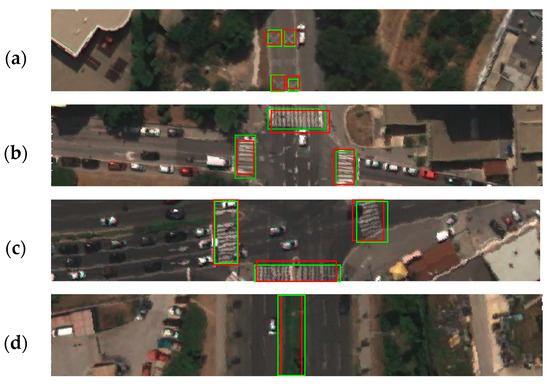 Examples of false positive, false negative, and misleading detections by trained YOLO detector. Green bounding boxes show ground truth objects, while red bounding boxes present predicted objects; (a) misleading detection of divided carriageways on non-inspected road; (b) false negative detection of side road pedestrian crossing; (c) false positive detection of inspected road crossing on roadside object; (d) false negative detection of side road pedestrian crossings.