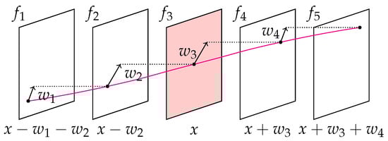 The displacements that occur between the five images are all given with respect to a common reference coordinate system, i.e., they are registered to the coordinate system of the reference frame , in order to simplify the optimisation of the minimisation problem. Hence, the displacement can be considered as an increment added to in order to gain the trajectory from to . The same accounts for .