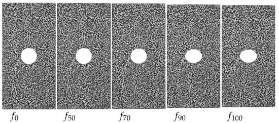 For the evaluation and performance classification of optical flow processes, benchmarks are used as the standard. Those provide different image sequences, which contain the currently prevailing difficulties of optical flow calculations. Among the best-known benchmarks in optical flow analysis are the Middleburry Benchmark [31] and the KITTI Benchmark [32], which was especially developed for autonomous driving. However, since the goal is not a universally applicable optical flow method, but rather, specifically aiming at the calculation of the displacements, strains, and strain rates occurring in a sheet metal sample, synthetically generated image sequences of a compression test of a perforated sheet metal sample were used instead of the above-mentioned benchmarks. This test has already been successfully used for validation purposes, and for a detailed description, refer to [33]. The introduction of a time scale was omitted for the artificial data, so that they remain without units. An excerpt of the synthetic image data that were used is depicted in Figure 2.