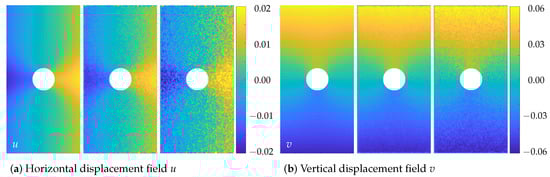 The displacement fields calculated under this parameter specification are shown in the first two rows of Figure 9, with the first line depicting the horizontal displacements u and the second line the vertical ones v.