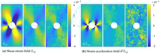 Over the years, simulations have become an essential part of many analyses and designs in science, as well as industrial application [1]. They allow verifying first drafts and investigating more advanced designs using experiments on real prototypes for validation. To perform meaningful numerical analysis and simulations, it is important to describe the mechanical properties of the materials that are used as accurately as possible. Next to the generally valid balance equations, these constitutive laws govern the continuum mechanics initial-boundary-value problem. Hence, the constitutive laws have to be determined with respect to the material and circumstances at hand. As they form the core to describe the system’s constitutive behaviour, material models in continuum mechanics become more complex, incorporating higher-order phenomena [2]. Hence, the extraction of higher-order motion information, i.e., the strain (In general, the strain represents a tensor-valued variable that describes the local deformation around a material point, ignoring rigid body motion.) and strain rate [2], or acceleration [3], from standard and complex motion patterns gains importance in the field of experimental mechanics. In particular, the robustness of evaluation methods to extract those fields from experimental data also under difficult conditions becomes important in this context [4,5,6]. These issues represent the main goal of the methods and investigations proposed in this paper.