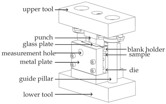 The shearing device consisted of an upper and a lower tool part. Their positioning with respect each other was achieved by two lateral guide columns. Clamped in a press, the force was applied to the sheet sample via these columns. As the force on the upper tool part increased, it was progressively lowered onto the lower tool part. The punch also moved with it and pressed the sheet metal sample, which was fixed with a blank holder, into the die. This process can be observed through the measuring hole in the metal plate. In addition, a glass plate was inserted between the metal plate and the sheet metal sample in order to be able to observe the plain strain state in the area of the measuring hole [2]. The cross-section of the shearing sheet metal was recorded by a high-speed camera over the duration of the test with a recording frequency of 2000 Hz through the measuring hole, through which the sample was simultaneously illuminated.