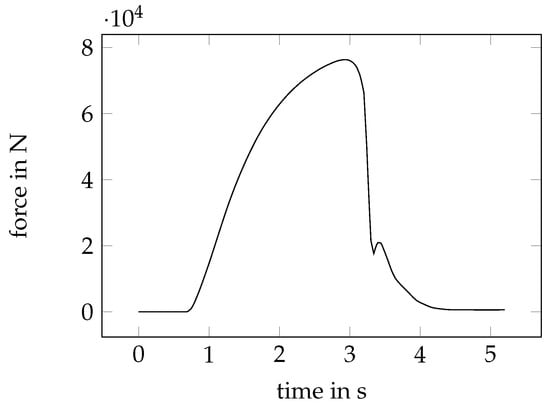 The corresponding force–time curve is visualised in Figure 8. At the beginning, a pre-force was applied. The actual shear process started from a time step of s with a constant speed of 1 mm/s. The initially linear increase of the elastic range changed into a plastic deformation. At s, the maximum force was reached and fracture occurred. Under subsequent analysis of the fracture surface, a secondary clean cut can be observed, which explained the second local force maximum.