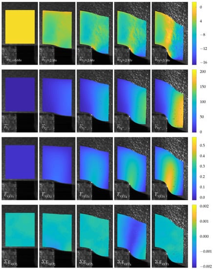 Displacement, strain, and strain rate fields of selected time steps, calculated via the STOF approach.