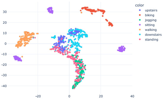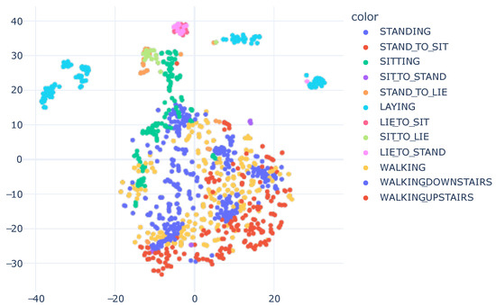 To better illustrate the original data distribution, Figure 11 displays the raw accelerometer data using t-SNE. The same process utilized to generate Figure 3 was applied to the HAPT dataset.