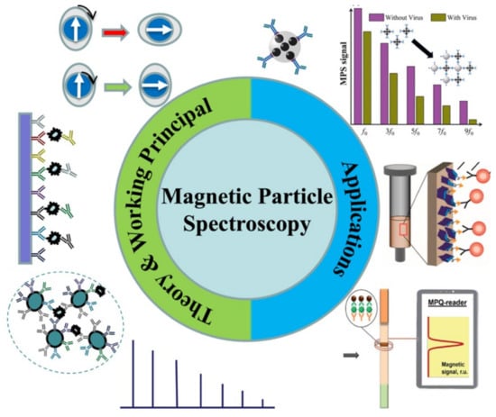For good reasons, magnetic particle spectroscopy has experienced significant growth in recent years. Unlike other methods, MPS-based bioassays directly measure magnetic responses from either magnetic nanoparticles (MNPs) or magnetic beads (MBs). This direct measurement approach is convenient and efficient (authors note, for convenience, in this review, we use MNP to represent both types of particles), and enables an analysis on minimally processed biological samples, e.g., without filtration, purification and wash steps. In addition, the MNP labels used in MPS-based bioassays bring more advantages to this platform (as well as to most types of magnetic biosensors): (1) the MNPs are superparamagnetic and they do not aggregate in liquid due to zero averaged magnetization in the absence of a magnetic field, which can effectively prevent false magnetic signals and clotting in blood vessels if used for in vivo applications [1]; (2) the magnetic property of MNPs allows for remote control by an external magnetic field, which enables the integration of MPS-based bioassays with drug delivery, hyperthermia, magnetic separation, etc. [2]; (3) the MNPs are very stable even in a harsh environment and will not undergo photobleaching like fluorescent dyes [3]. Furthermore, MNPs made from iron oxides are nontoxic to cells and biological tissues, enabling their current extensive utilization in magnetic hyperthermia therapy, drug delivery, magnetic biosensing, magnetic separation and imaging [4,5,6,7,8].