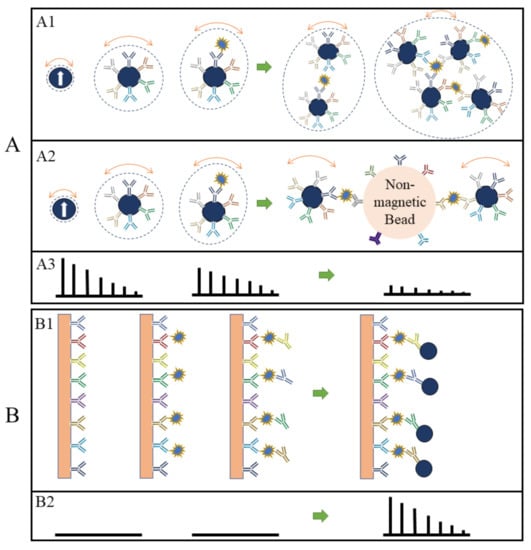 In the volumetric-based MPS bioassay method, MNPs are functionalized with capture probes that can specifically bind to target analytes (for example, via antibody–antigen recognition) in liquid. As shown in Figure 4A, MNPs are surface-functionalized with polyclonal detection antibodies. In the presence of target antigens, these polyclonal antibodies will bind to different epitopes from each protein molecule, thus causing the cross-linking of MNPs. As a result, the hydrodynamic sizes of MNPs increase, as well as the Brownian relaxation time. Thus, lower harmonic amplitudes and a larger phase lag are observed as schematically drawn in Figure 4(A3) [48,62,63]. In another example of the volumetric-based method as shown in Figure 4(A2), non-magnetic beads are introduced as the reaction surface to further reduce the rotational freedom of the MNPs. As a result of these binding and clustering events, the MPS spectrum in Figure 4(A3) becomes weaker and weaker as Brownian relaxation is hindered. The volumetric-based MPS bioassay method is a homogeneous bioassay platform that spots the target analytes straight from the liquid sample without wash steps, making it suitable for future point-of-care (POC) applications. Currently, the volumetric-based MPS bioassays demonstrate a high bioassay sensitivity and specificity, as well as the ability to multiplex different analytes in a single sample [64,65,66].