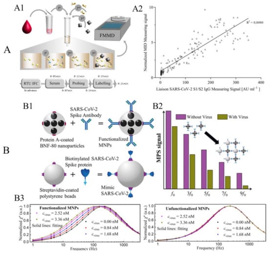 Jin Zhong et al. reported a volumetric-based MPS assay scheme for the detection of mimic SARS-CoV-2 virus particles, namely the SARS-CoV-2-spike-protein-coated polystyrene beads [16]. They used protein-A-coated multi-core 80 nm BNF-80 MNPs (purchased from micromod Partikeltechnologie GmbH, Rostock, Germany) with an iron concentration of 5.5 mg/mL and a molar particle concentration of 20 pmole/mL. These MNPs are anchored with anti-SARS-CoV-2 spike protein antibodies (purchased from Biomol GmbH, Hamburg, Germany), as illustrated in Figure 6(B1). Because of the strong binding affinity between protein A and the Fc fragment of the antibody, the anti-SARS-CoV-2 spike protein antibodies can readily attach to the surface MNPs after 12 h of incubation at 4 °C without any additional wash steps. Then, these antibody-functionalized MNPs are mixed with different concentrations of SARS-CoV-2-spike-protein-coated polystyrene beads (i.e., the mimic SARS-CoV-2 virus particle). As shown in Figure 6(B2), the higher harmonic spectra are influenced by the addition of mimic SARS-CoV-2 particles since these BNF-80 MNPs are Brownian-relaxation-dominated. In the absence of SARS-CoV-2 mimic particles, the functionalized MNPs can rotate freely, following tightly with the external driving fields, producing a strong harmonic signal. However, in the presence of SARS-CoV-2 mimic particles, MNPs bind to the mimic SARS-CoV-2 and their effective hydrodynamic sizes increase. As a result, the lower degree of rotational freedom leads to a significant decrease in the MPS spectra. Consequently, the amount of SARS-CoV-2 mimic particles present in the liquid sample can be determined by analyzing the MPS spectra. Their proposed approach allows for the rapid detection of mimic SARS-CoV-2 with a limit of detection of 0.084 nM (5.9 fmole) for mimic virus particles. This approach has great potential for designing an affordable POC device for fast and sensitive diagnostics of SARS-CoV-2.