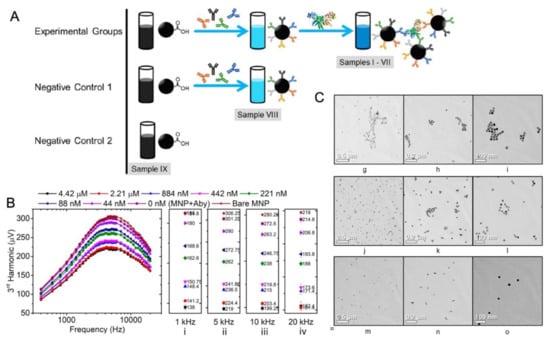 In another work, Wu et al. reported a volumetric-based MPS method for the detection of the H1N1 nucleoprotein (Catalog# 11675-V08B, Sino Biological Inc., Beijing, China) [88]. As shown in Figure 7A, the rabbit IgG polyclonal antibody (Catalog# 11675-T62, Sino Biological Inc., Beijing, China) is anchored onto the MNPs through a standard EDC (carbodiimide) cross-linking reaction scheme. In the experimental groups, cross-linking takes place between the antibody-functionalized MNPs and the H1N1 nucleoprotein, which leads to the MNP clusters. In the negative control groups, either MNPs are not functionalized with antibodies (labeled as ‘Negative Control 2′ and ‘Bare MNP’) or functionalized MNPs are not mixed with the target H1N1 nucleoprotein (labeled as ‘Negative Control 1′). The third and the fifth harmonics, along with the third over the fifth harmonic ratios (R35), were used as metrics for the quantification of target analytes from bio-fluids. These harmonics from nanogram quantities of iron oxide MNPs can be detected within 10s. Figure 7B shows the third harmonic amplitudes of MNPs added with different concentrations of the H1N1 nucleoprotein compared with the negative control groups (i.e., 0 nM and bare MNP). They observed that the H1N1 nucleoprotein can be detected with a high sensitivity (as low as 44 nM or 4.4 pmole) using this volumetric detection scheme, which is comparable to the analytical sensitivity of fluorescent assays. The transmission electron microscopy (TEM) images of MNPs after bioassays were taken. As shown in Figure 7C, higher concentrations of target analytes lead to higher degrees of MNP clusters, whereas, for the control group, MNPs are well-dispersed, and no significant clusters are observed, confirming that the MPS harmonic signal change is caused by the MNP clusters and the lower degree of rotational freedom. By combining MPS with the artificially induced MNP clusters, they achieved a sensitive, rapid and wash-free magnetic bioassay. Furthermore, this detection strategy is suitable for targeting and quantifying a wide range of biomarkers.
