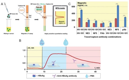 Bargina et al. proposed a surface-based MPS assay strategy that utilizes lateral flow (LF) strips and MNP labels in a sandwich configuration to detect a polyvalent hepatitis B surface antigen (HBsAg) [18]. In order to conduct the test, a serum sample is mixed with MNPs that are conjugated with anti-HBsAg antibodies (in their work, both monoclonal (mAb) and polyclonal (pAb) anti-HBsAg antibodies were tested). Liquid samples are prepared by spiking different amounts of HBsAg in healthy human serum. The serum sample is first mixed with functionalized MNPs for specific binding in the liquid phase as shown in Figure 8A. Through capillary forces, the sample moves toward the absorbent pad and flows onto the test line of the LF strip, where capture antibodies that recognize another available epitope of HBsAg are immobilized. If HBsAg is present in the serum sample, the sandwich structure immobilizes MNPs at the test line (Figure 8A) in order to analyze the binding kinetics and affinity of four mono- and polyclonal antibodies (mAb clones HV-101, NE3, NF5 and pAb) to the HBsAg. The sensograms were collected to depict the real-time association and dissociation between HBsAg and the antibodies using optical label-free biosensors known as SCI and SPI. An example of a characteristic sensogram of interaction between mAb HV-101 and HBsAg is shown in Figure 8B.