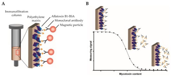 (A) An immunofiltration column coated with AFB1-BSA mycotoxin conjugate is used, with biotinylated monoclonal antibodies targeting AFB1 bound to the column. MNPs functionalized with streptavidin are used by MPS to detect the bound antibodies. (B) A competitive binding assay method is used. Serially diluted free AFB1 was added in the column to compete for the binding sites with the coated AFB1. Non-saturated antibodies bind to the coated antigen and are retained within the matrix, whereas saturated antibodies are flushed through the column. Then, streptavidin-functionalized MNPs are applied to the column, binding to the retained antibodies, and detected by MPS. Figure reprinted from Ref. [17], distributed under the terms of the Creative Commons Attribution License.