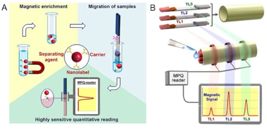 In addition, the same group reported the multiplexed assays on this MPS-LFA platform [106]. As shown in Figure 10B, they significantly improved the sensitivity and linear dynamic range of their MPS (MPQ readers) by integrating three measuring inductive coils, which were interrogated by a single processor unit. The advanced electronics enables the reading of these coils separately and sequentially at adjustable time intervals, while still retaining the detection parameters of a 60 zmol sensitivity and 7-order linear dynamic range, which are unmatched by any other detection method. The assays employed a sandwich lateral flow assay (LFA) with MNP labels. In order to conduct the assay, a sample is placed on the sample pad and migrates along the test strip through capillary action. The sample interacts with the dry MNP-Ab conjugate at the conjugation pad, and then the target antigen binds to the MNP-Ab complexes and the capture Ab on the test line (TL). A magnetic control line (CL), like that of conventional LF strips, is added as a control to prevent the false positive result.