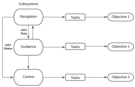 This research follows a structure divided into three main components of a USV platform: guidance, navigation, and control [5]. These subsystems collaborate to complete the mission in optimal conditions. Therefore, the objectives defined in the last paragraph of the introduction were answered through tasks directly related to the performance of the subsystems, as shown in Figure 1. The partitioning of the system provides a solid direction for efforts to create a novel platform.