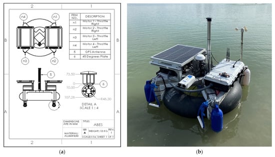 The ABES has dimensions of 940 mm × 950 mm × 1000 mm and adopts a rectangular shape with a thruster attached to each end, symmetrically calculated to prevent roll and pitch movements. A lightweight aluminum structure with an inflatable tube in the center for floating redundancy capabilities provides stability under excessive load, giving a boat draft of 500 mm. This configuration allows the vehicle to perform omnidirectional movements to explore different representations of water bodies. The vehicle has multiple applications due to its flexible capabilities.