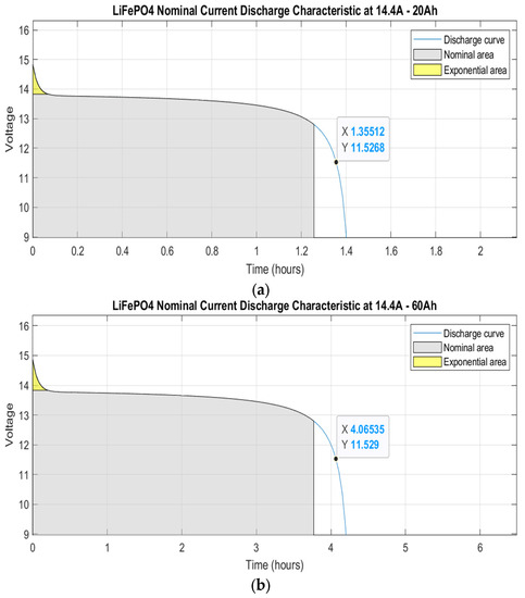 Nominal current discharge curve: (a) LiFePO4 20 Ah battery capacity; (b) LiFePO4 60 Ah battery capacity.