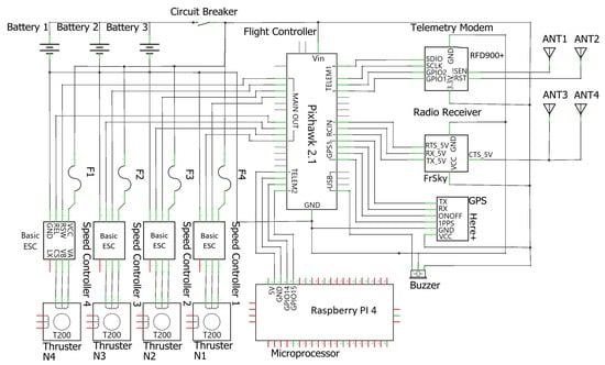 Figure 5 illustrates the electrical diagram of the platform, with all the electronic components interconnected to make the boat able to navigate. The flight controller (Pixhawk 2.1®) and the microprocessor (Raspberry Pi 4®) are the electronic system’s brains that control the different functions and parameters of the driver, modules, and receivers.