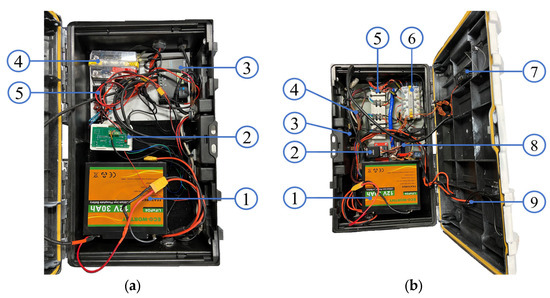 Sensor integration. (a) Left enclosure box configuration: (1) LiFePO4 30 Ah battery; (2) sensor integration with microprocessor (Raspberry Pi 4) + PCB design; (3) Wanderer solar charge controller; (4) dual bus bar terminal; and (5) voltage regulator (Castle CC Bec Pro). (b) Right enclosure box configuration: (1) LiFePO4 30 Ah battery; (2) flight controller (Pixhawk 2.1); (3) telemetry modem (RFD900+); (4) buzzer; (5) speed controller—driver (Basic ESC); (6) dual bus bar terminal; (7) radio receiver (FrSky Taranis); (8) current/voltage control board; and (9) circuit breaker.