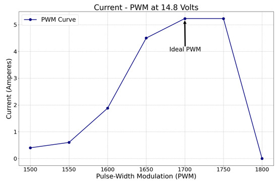 The pulse-width modulation (PWM) parameter can be regulated in the platform to reduce the average energy delivered to the actuators by an electrical signal controlled by the drivers. It was employed to define the power required for ideal vehicle navigation without compromising the payload. PWM signals are pulse trains with a fixed frequency, magnitude, and variable pulse width. The fundamental frequency, such that the energy delivered to the motor and its loads, depends mainly on the modulating signal (PWM) [76], hence the parameter to be evaluated in Figure 7. Since the thrusters were the devices that consumed more power, this study was focused only on the current drop by the prolusion system. The modulation signal, or PWM value, is plotted from 1500 to 1800 in the “X-axis,” at a fixed voltage of 14.8 V, against the current consumption in the “Y-axis.” The ideal PWM configuration was set to 1700 because it is at the point where the maximum current is provided before an electrical circuit overcurrent happens or power is wasted. Since the voltage is fixed, the more current there is, the more power is delivered to the motors. However, to prevent damage to any electronic component, the rated amperage capacity should not be exceeded, which is directly controlled by the PWM configuration. The thrusters utilized an average of 5.23 A at the ideal PWM.