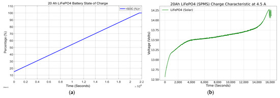 (a) 20 Ah LiFePO4 battery state of charge powered by SPMS and (b) 20 Ah LiFePO4 battery charge characteristics at 4.5 A.