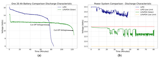On the other hand, the LiFePO4 batteries, ideal for solar applications, have a nominal voltage of 12.8 V. The plots in Figure 10a compare the two-battery system; on the “Y-axis” is the voltage, and on the “X-axis” is the time. One LiPO battery with four full-power thrusters can last 77 min before it reaches the cut-off voltage (11.5 V). However, the SPMS with the panel constantly charging the battery can last up to 122.1 min before the cut-off voltage (10 V) is reached. Based on the laboratory results, the SPMS is estimated to increase the duration of a mission by 37% over the standard LiPO battery system. These estimations confirmed the simulation calculations presented in the methodology section. Hence, as designed, a power system that triples the capacity to 60 Ah was sufficient to power the platform for more than four hours.