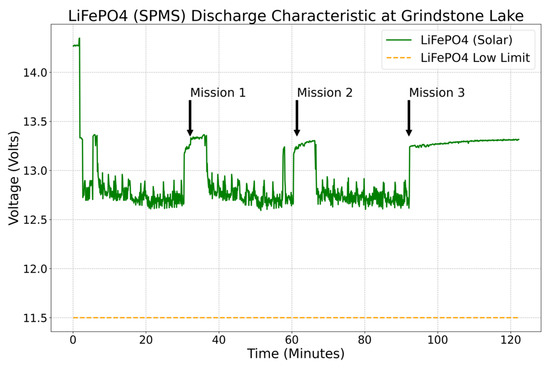 Figure 11 shows the voltage behavior at Grindstone Lake during three separate missions of 30 min each. The arrows in the plot indicate when a mission ends and when the prototype returns to its home position. While there is no current discharge, the voltage increases until the next mission starts because the SPMG charges the batteries while the thrusters are not in use.