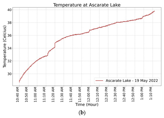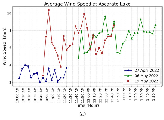 One of the goals of the system was to be able to make decisions autonomously. Hence, sensors to collect meaningful data were required to control the boat based on safety restrictions. The wind and temperature monitoring are shown under a range of scenarios. The microprocessor reads the values of the voltage (V), wind speed (km/h), and temperature (°C) of the system every 6 s. Figure 12a shows the average wind speed every 10 min at Ascarate Lake, with an average maximum wind speed of 11 km/h. The data collected served as the basis for determining the platform’s operational speed limit at 20 km/h. However, the vehicle demonstrated its ability to navigate for 20 min in hazardous weather conditions where the wind was around 25 km/h.